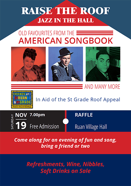There is so much talent in our Parish and it was much in evidence back in March when the Friends of St Ruan and St Grade put on a musical evening in the Village Hall in aid of the Grade Roof appeal, It was advertised as an evening of jazz and there was certainly plenty of jazz, but also blues and soul, with a bit of rock thrown in for good measure.
