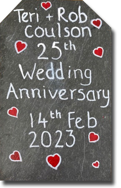 Congratulations to Teri and Rob Coulson, who after visiting St Grade recently, decided to purchase a slate through Just Giving and to dedicate the slate in celebration of their 25 years of marriage 14th February 2023. Happy Anniversary!